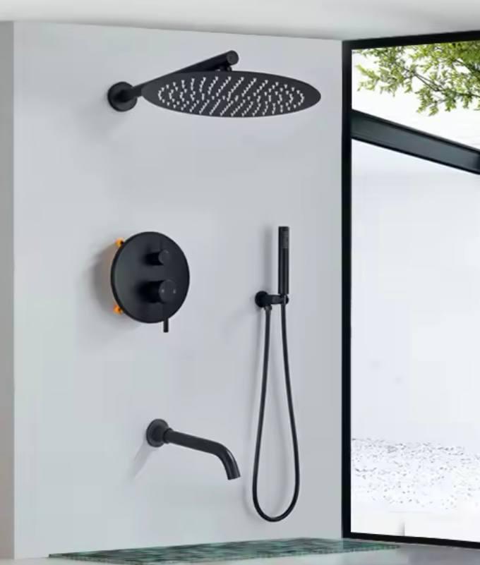 Комплект включает в себя: смеситель скрытого монтажа, настенное крепление с лейкой тропического душа диаметром 25 см, лейку ручного душа с креплением на стену и излив
