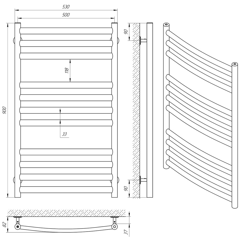 Рушникосушарка - 1 шт, кріплення (шуруп оцинкований з дюбелем, п'ятак, втулка, штифт, стійка) - 4 шт, кран Маєвського 1/2 " - 1 шт, заглушка різьбова 1/2 " - 2 шт, ковпачок декоративний - 2 шт, ключ шестигранний - 1 шт, упаковка (короб гофрокартонний, чохол поліетиленовий, чохол поліетиленовий для кріплення, короб гофрокартонний для кріплень) - 1 шт, паспорт - 1 шт.