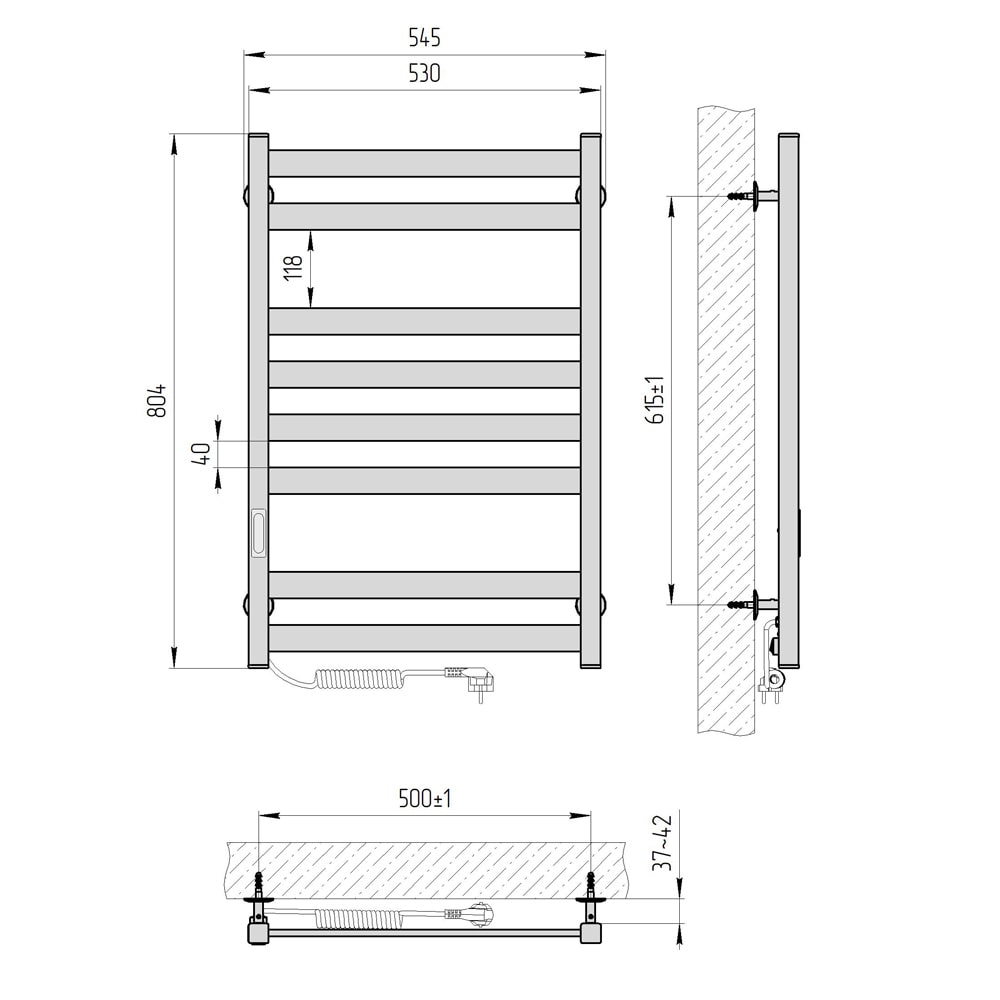 Особливості: керує нагрівом електрорушникосушарки мікропроцесорний термоконтроллер (кнопкове управління). Для початку роботи необхідно задати температуру рушникосушарки. Термодатчик контролює температуру поверхні рушникосушарки, що виключає можливість її перегріву. Серед переваг регулятора - зберігання обраного режиму роботи (при відключенні робота відновитися в запрограмованому користувачем режимі), наявність таймера відключення (3h) і колірної індикації роботи!