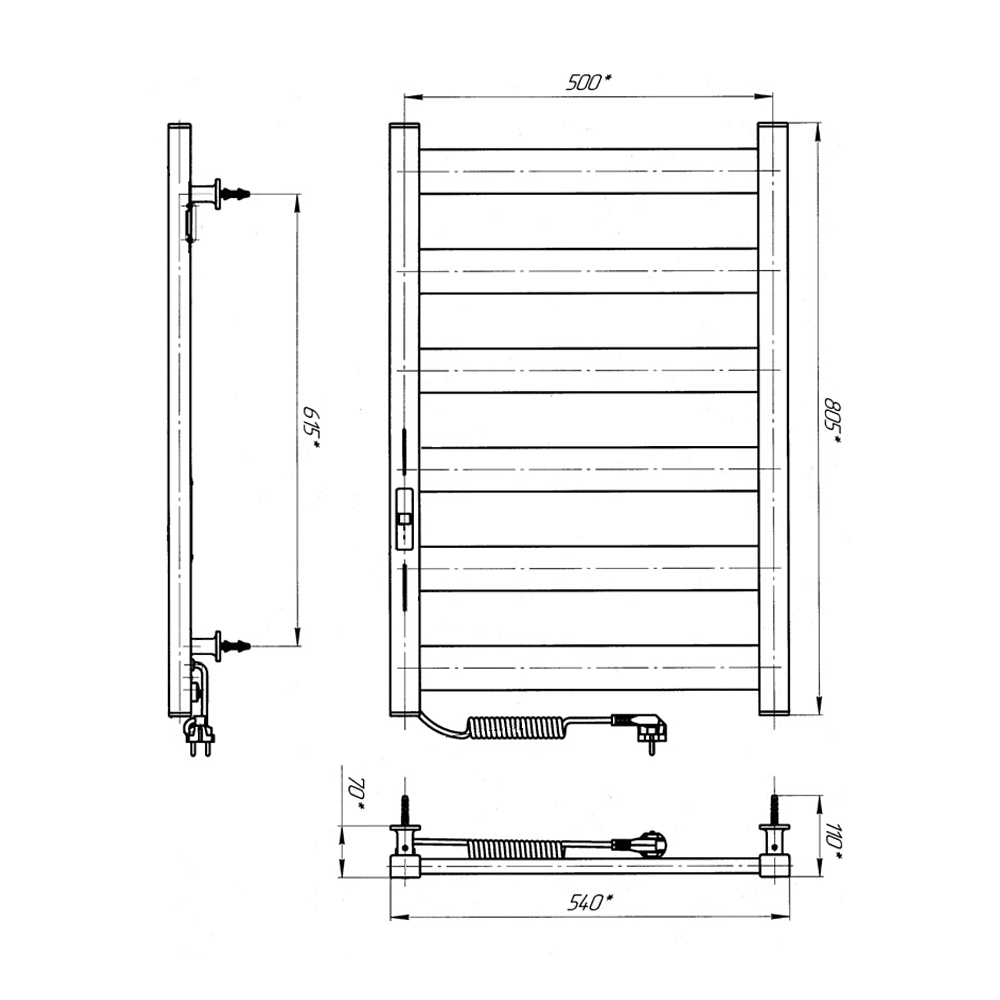 Особливості: керує нагрівом електрорушникосушарки мікропроцесорний термоконтроллер (кнопкове управління). Для початку роботи необхідно задати температуру рушникосушарки в градусах. Термодатчик контролює температуру поверхні рушникосушарки, що виключає можливість її перегріву. Серед переваг регулятора - автоматичне зниження потужності (ЕКО-режим), наявність таймера відключення (1-12h) і блокування кнопок (захист від дітей)!