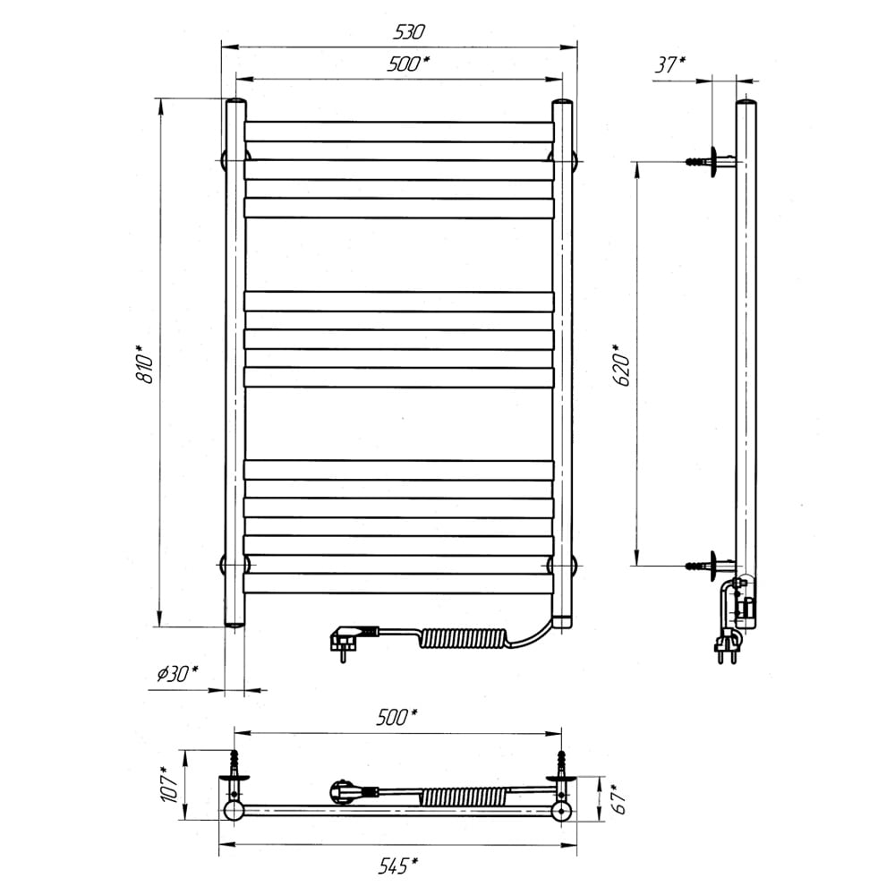 Рушникосушарка – 1 шт, кріплення (шуруп оцинкований з дюбелем, п'ятак, втулка, штифт, стійка) - 4 шт, ключ шестигранний – 1 шт, упаковка (короб картонний, чохол поліетиленовий, чохол поліетиленовий для кріплення, коробочка для кріплень) – 1 шт, паспорт – 1 шт.
